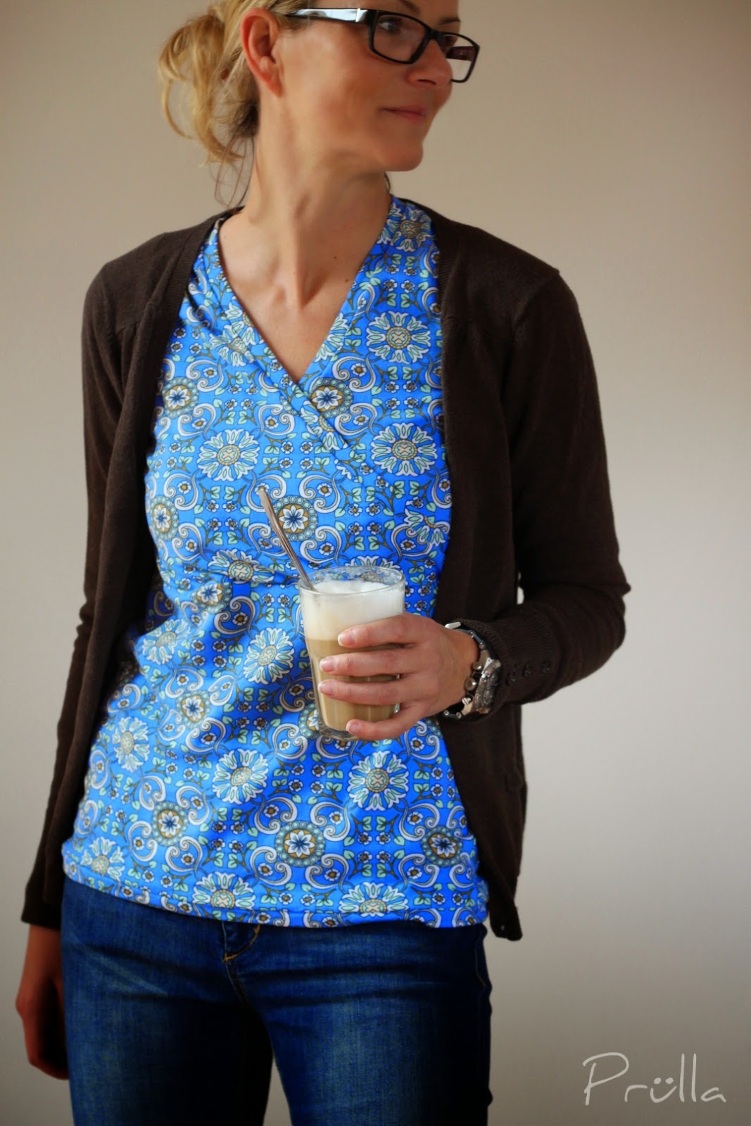 Die ist ja der Hammer!! Sooo schön und der Stoff gefällt mir total gut. Ich finde blau zu braun einfach genial und nunja – ich muss zugeben ich habe echt einen Hang zu Wickelteilen 😉