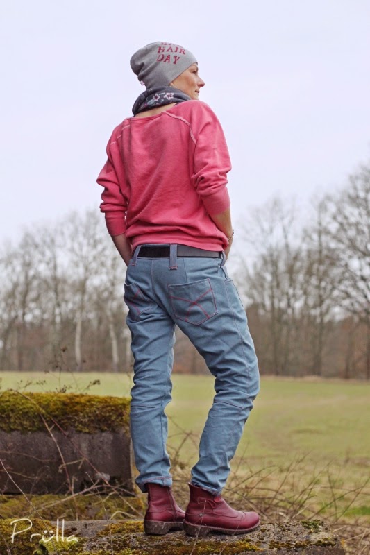 Die Hose ist immer noch zu groß und ohne Gürtel flutscht sie mir vom Hintern. Aber ich mag den Schnitt wirklich!! Das Ebook ist sehr gut beschrieben und alle Teile passen super zueinander.