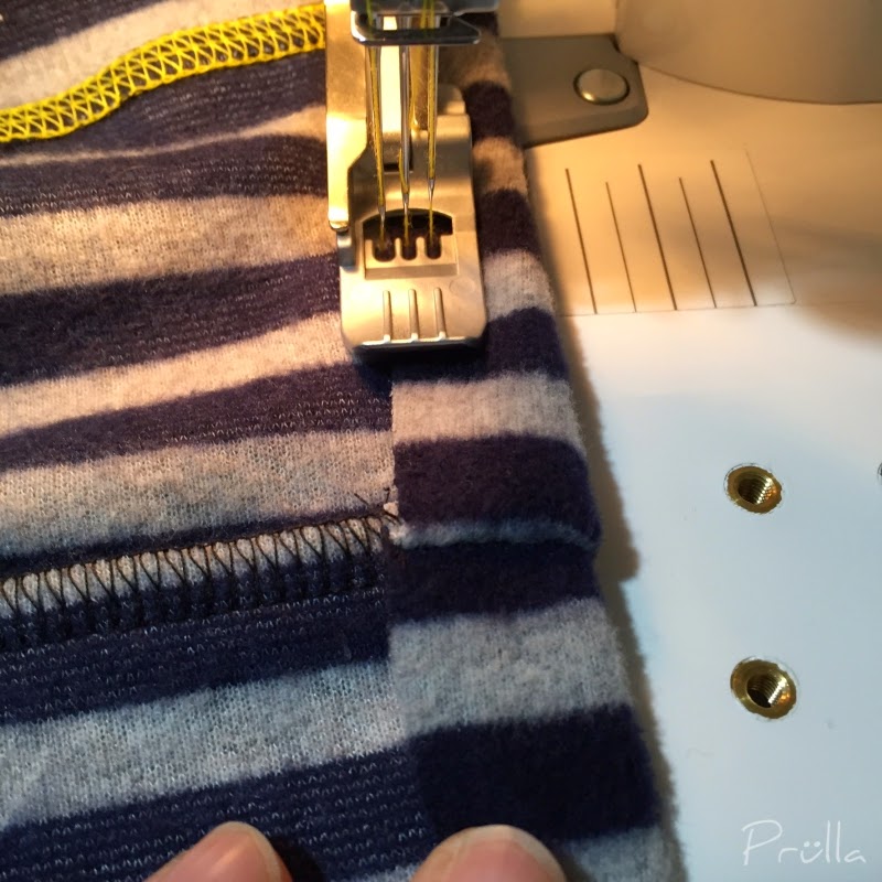 Zuerst mit der Overlock die Kante gesäubert, um darüber zu covern – die Zickzack-Covernaht soll von außen sichtbar sein…